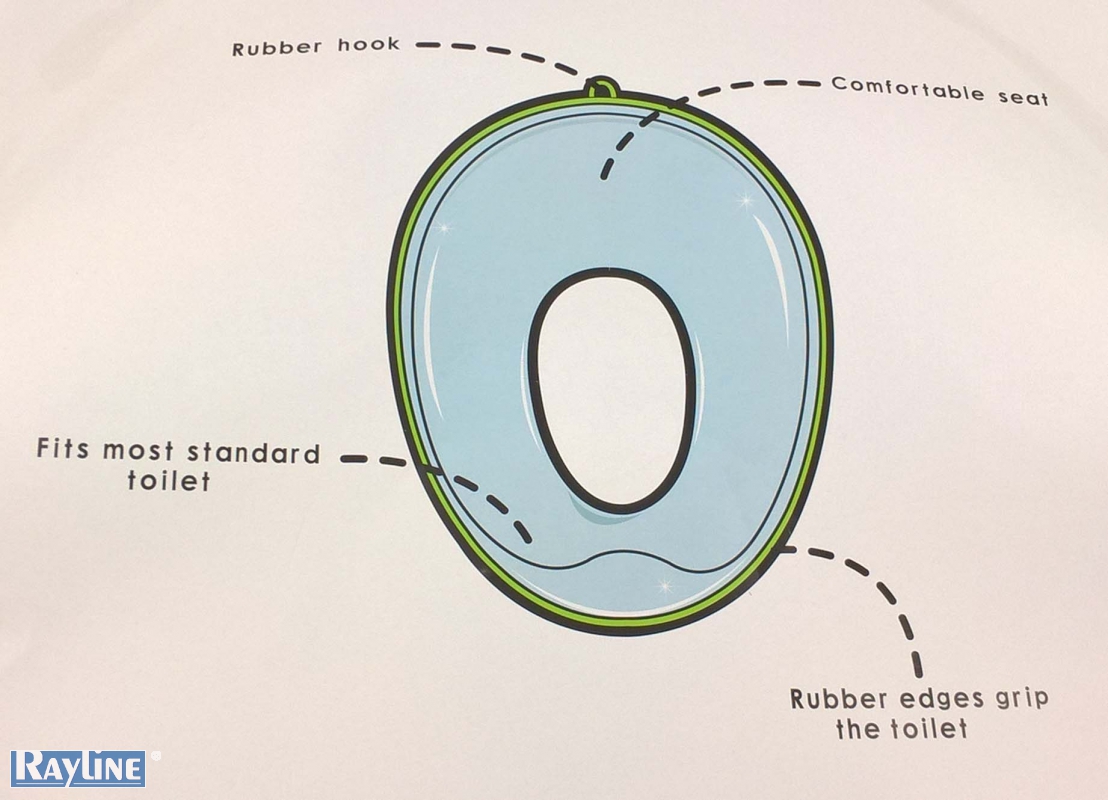 Der Sitz passt auf die meisten Standard WC-Sitze, hat eine Gummischicht am unteren Rand, damit er nicht verrutschen kann. Eine kleine Öse ist auch am Rand, damit man den Sitz Griffbereit in die Nähe hängen kann.