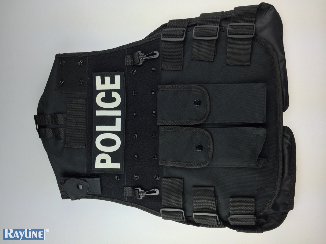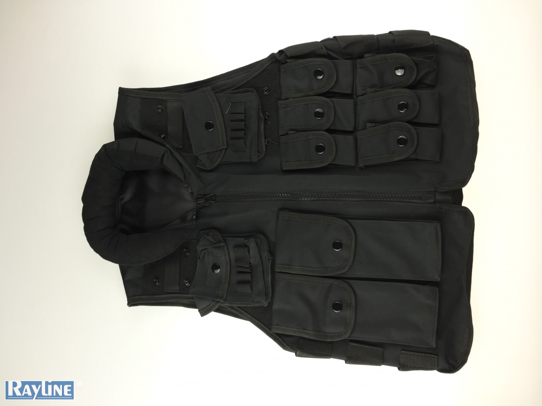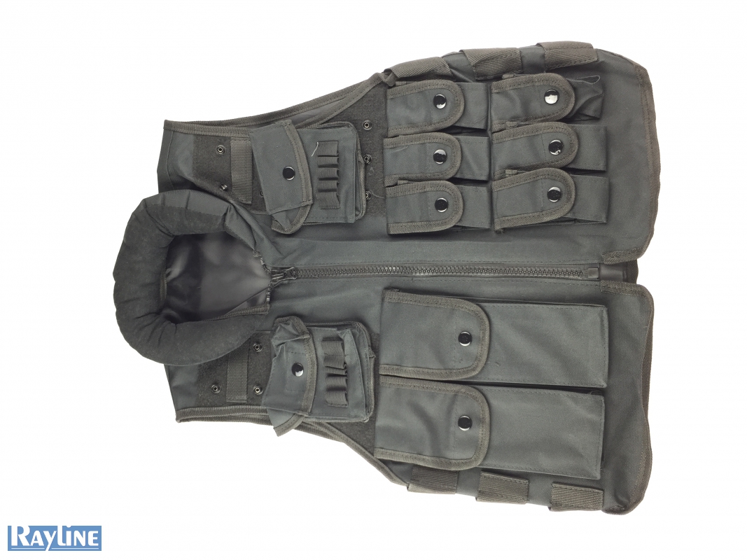 Eine schwarze Weste im Polizei Look, mit vielen Taschen und Druckknöpfen.