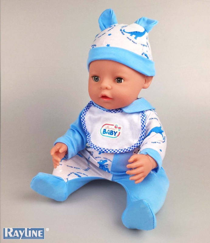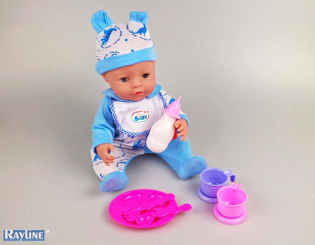 Blau: Puppe, Mütze, Strampler, Latz, Fläschchen, Besteck 2x, Teller, Tassen 2 x