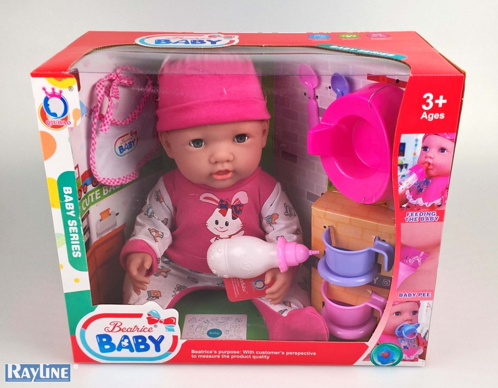 Pink: Puppe, Mütze, Shirt, Hose, Latz, Fläschchen, Besteck 2x, Töpfchen, Tassen 2 x