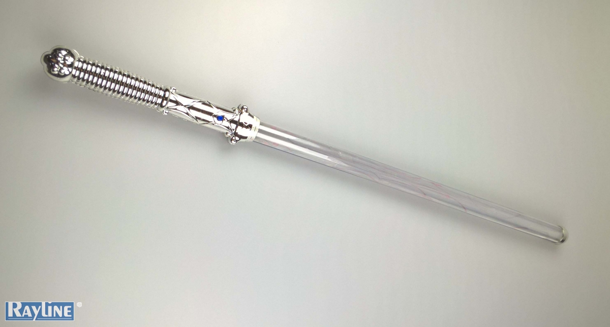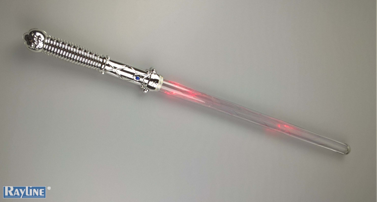 Das Schwert hat einen Chromfarbenen Griff und leuchtet abwechselnd in 3 Farben.
