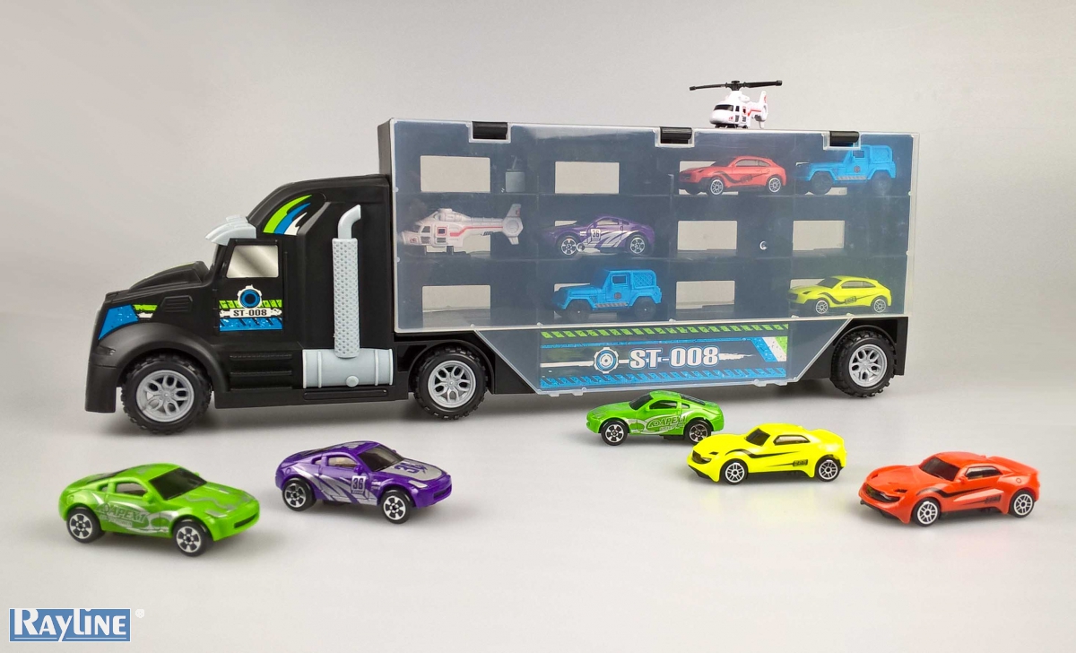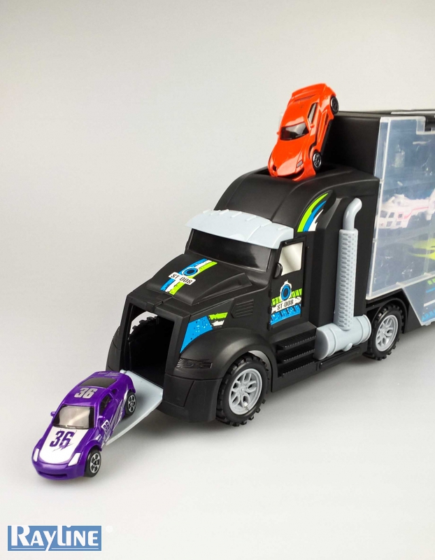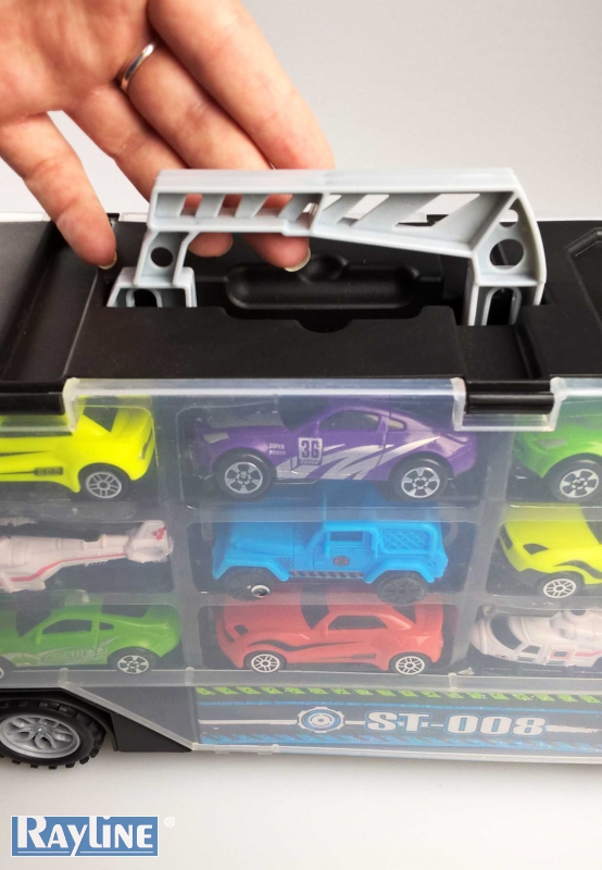 Dazu ist auf der rechten Seite des Busses noch Platz für 12 weitere Autos aus der eigenen Sammlung. Der LKW ist also praktisch um alle Autos unterzubringen und alles mitzunehmen, denn durch den Griff kann der LKW als Koffer transportiert werden. Das kleine Highlight ist die Rutsche im forderen Teil des LKW.